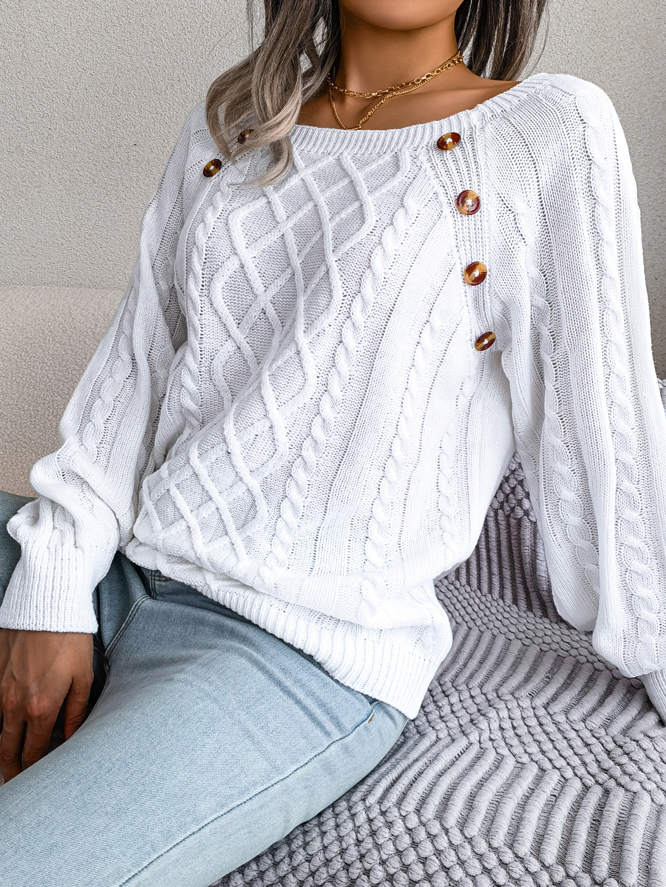 Dieser modische Grobstrickpullover in strahlendem Weiß ist ein Blickfang für die kühle Jahreszeit. Das elegante Rautenmuster und die dekorativen, braunen Knöpfe am Ausschnitt verleihen ihm eine luxuriöse Note. Das weiche Acryl-Material bietet optimalen Tragekomfort und Wärme. Die lockere Passform macht diesen Pullover zum idealen Kombinationspartner für Jeans und Röcke, perfekt für einen stilvollen und gemütlichen Street Style.